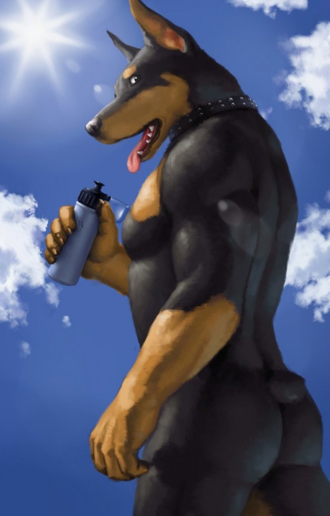 Seeing Suarez in the light of day was a surreal experience. The night before, he’d assumed the man was wearing at least a pair of shorts but, no, he was entirely naked, his only ‘clothing’ being a pelt of very short but very dense fur. Brighton looked away awkwardly when he saw Suarez’s crotch. A huge pair of black balls dangled between his thighs and his penis was encased in a furry sheath. His fur was deep black but there were patches of russet fur on his chest, the sides of his head and his pointed ears. Suarez’s face was the only part of him that remained unchanged…with the exception of his sharp teeth and long tongue. The rest of him really was more dog than human.